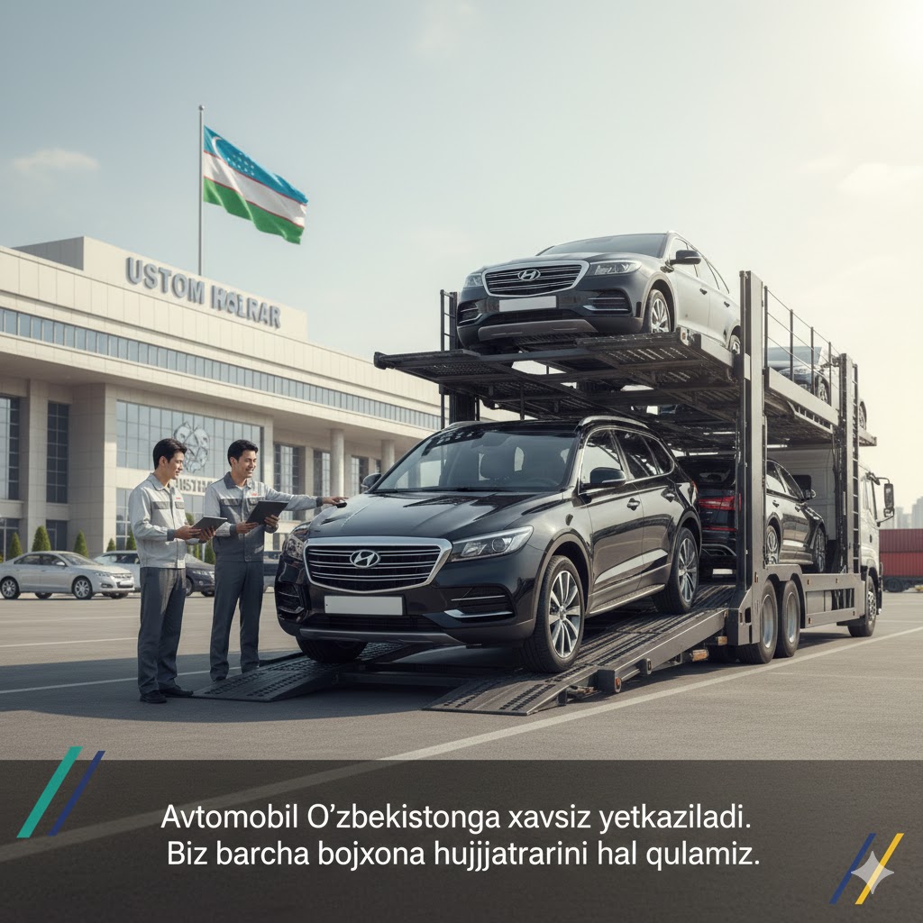 Avtomobil Koreya portidan jo'natiladi va O'zbekistonga xavfsiz yetkaziladi. Biz barcha bojxona deklaratsiyalarini va rasmiylashtirish ishlarini hal qilamiz.
